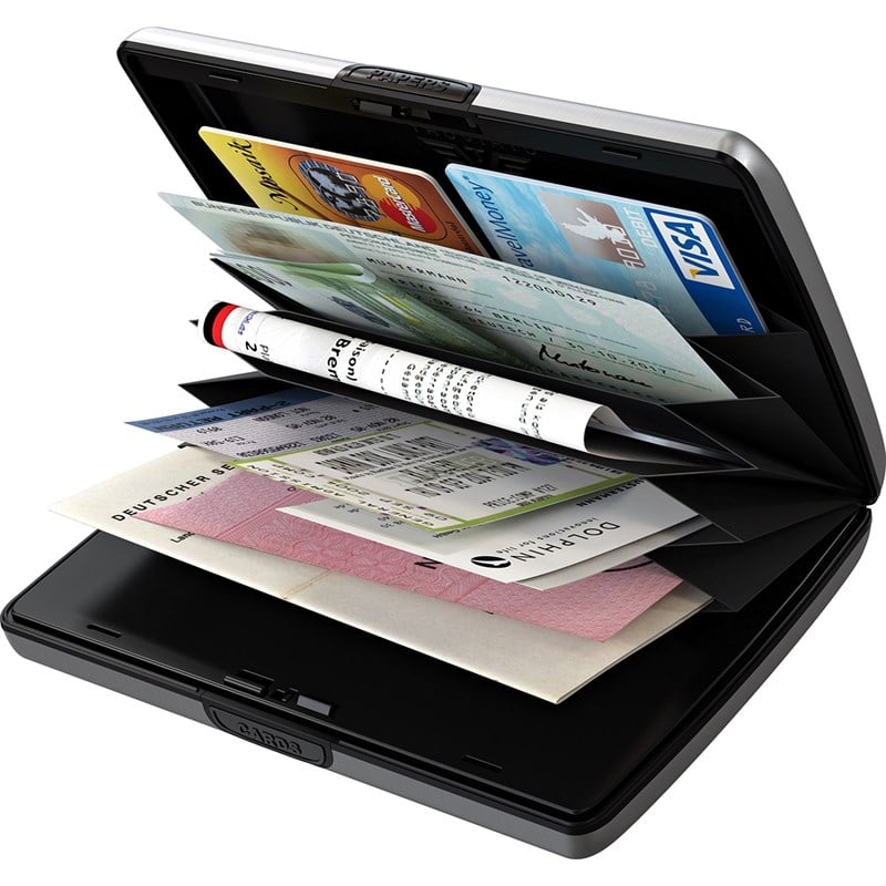 Tru Virtu® Papers & Cards, patentli çift bölmeli tasarıma sahip büyük boy alüminyum cüzdan.
